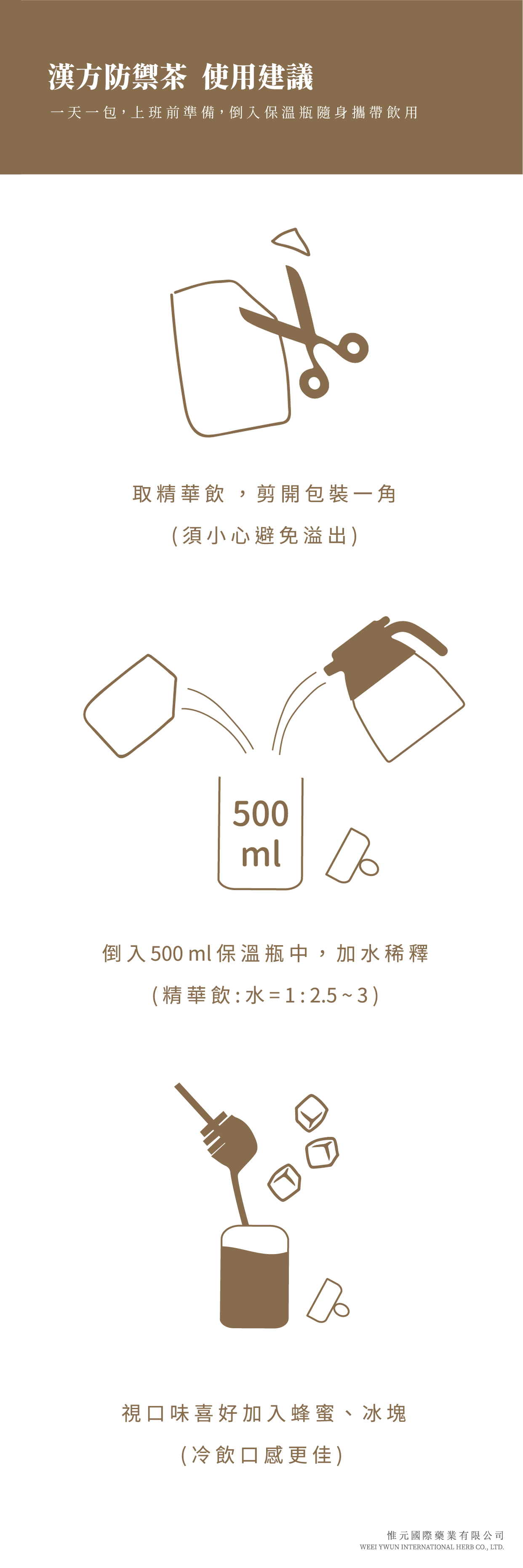 此漢方防禦茶為中醫院所醫師之建議配方,於康健雜誌 / 中藥商公會 / 中醫院所 等處皆有分享,一天飲用 1-2 包,提升免疫力。