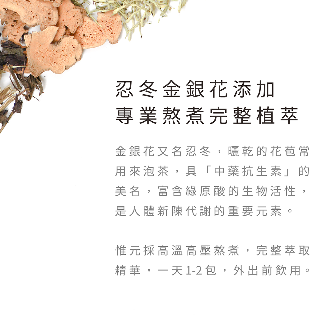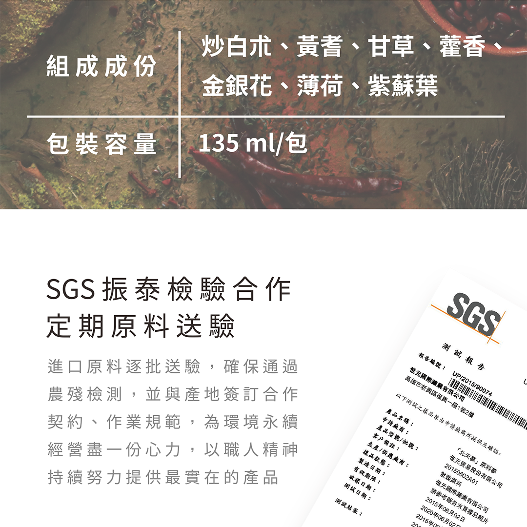 原料:水、炒白朮、黃耆、甘草、藿香、金銀花、薄荷、紫蘇葉