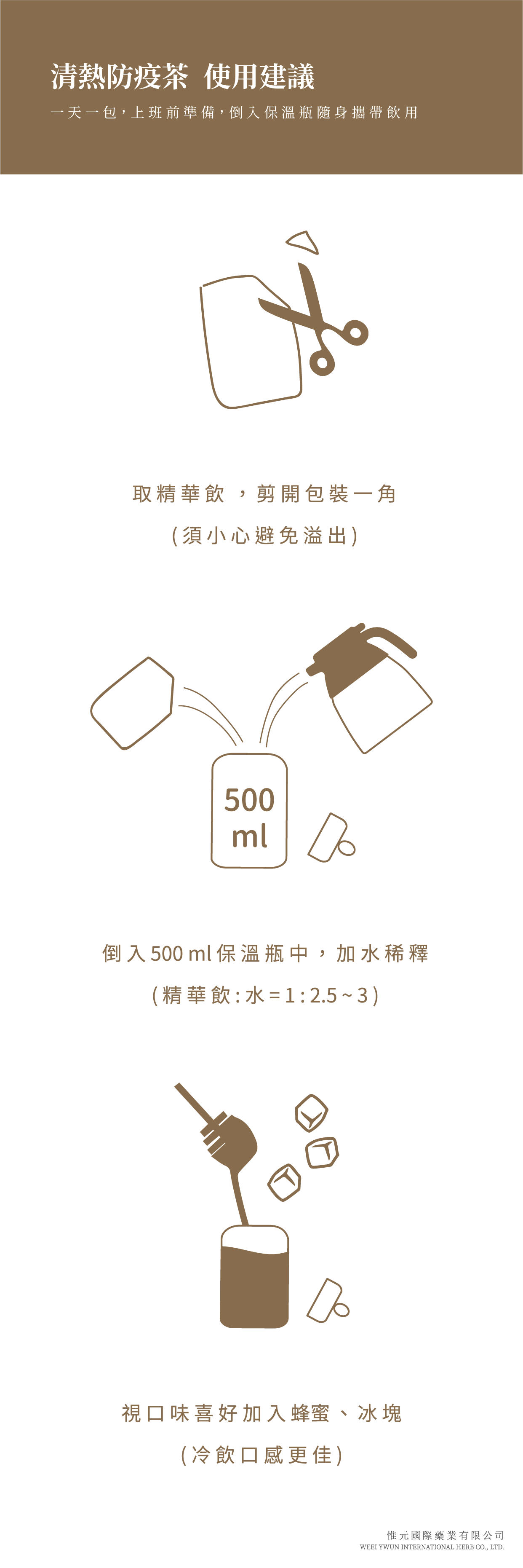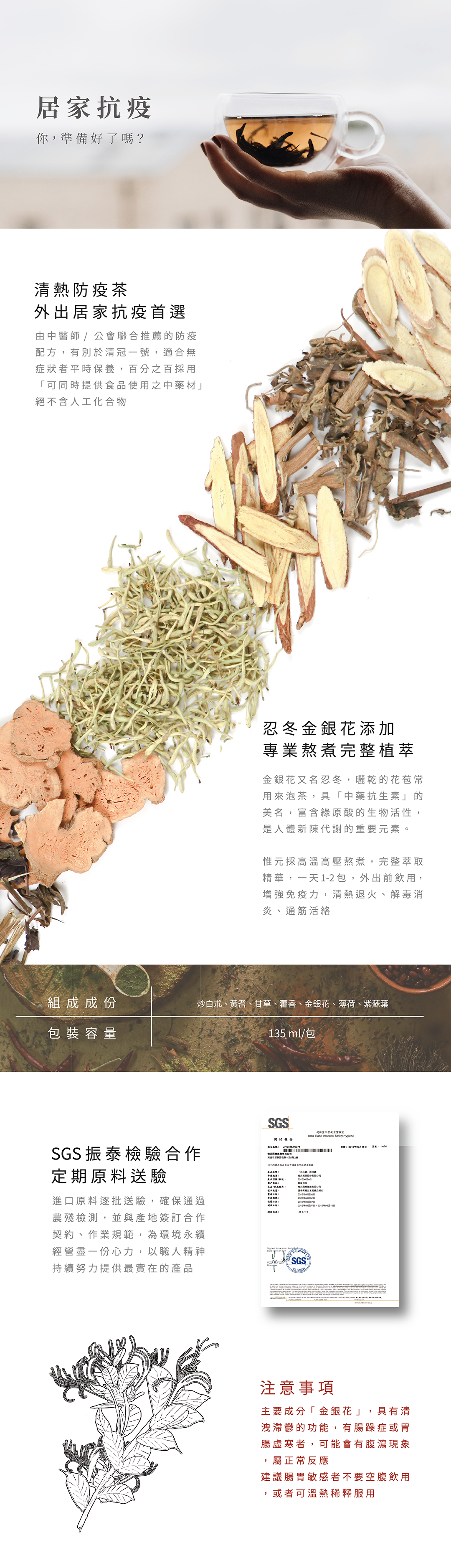 此清熱防疫茶為中醫院所醫師之建議配方,於康健雜誌 / 中藥商公會 / 中醫院所 等處皆有分享,一天飲用 1-2 包,提升免疫力。