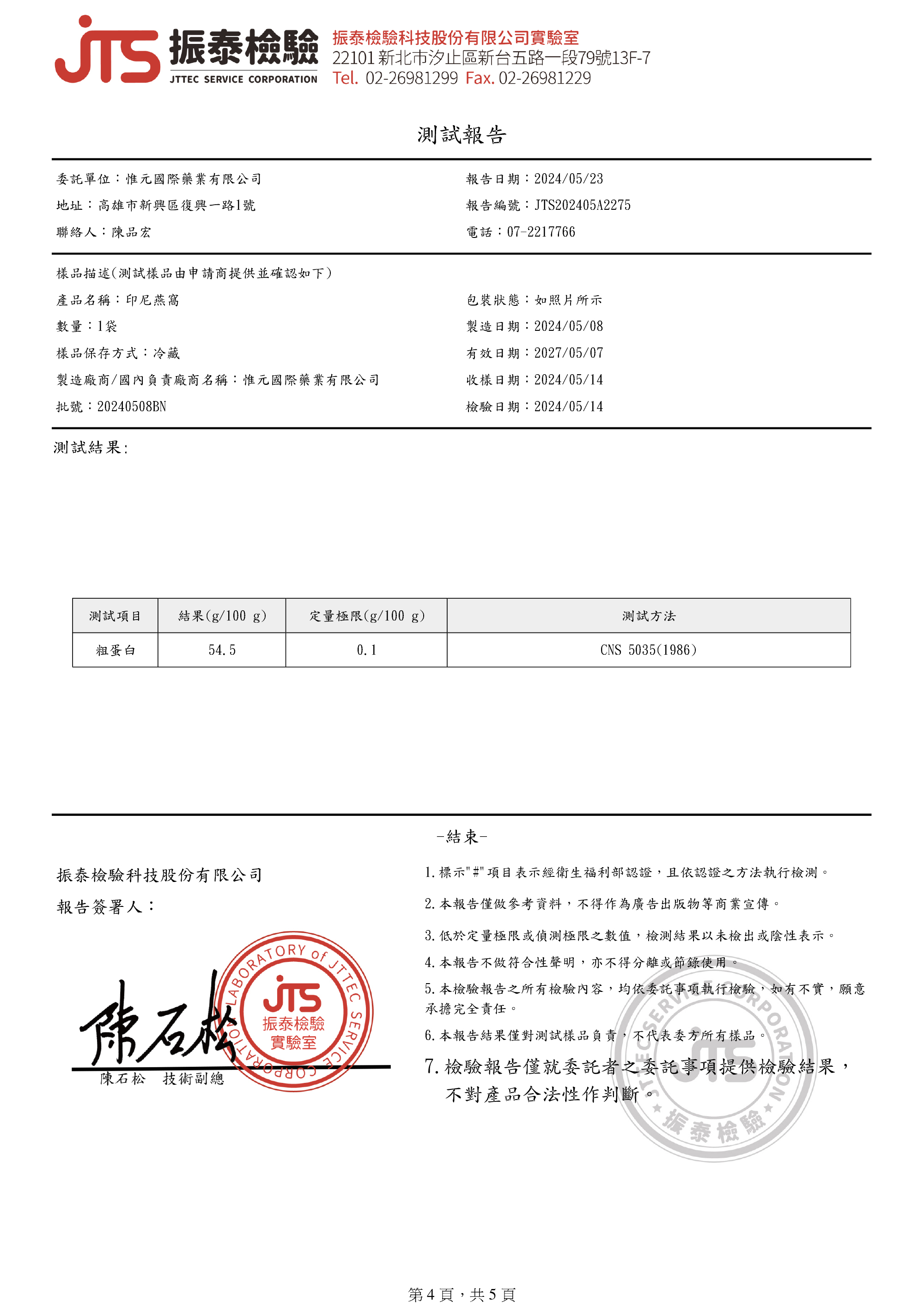燕 王 牌 燕 窩 原 料 檢 驗 ( 檢 驗 日 期 2024/05 )