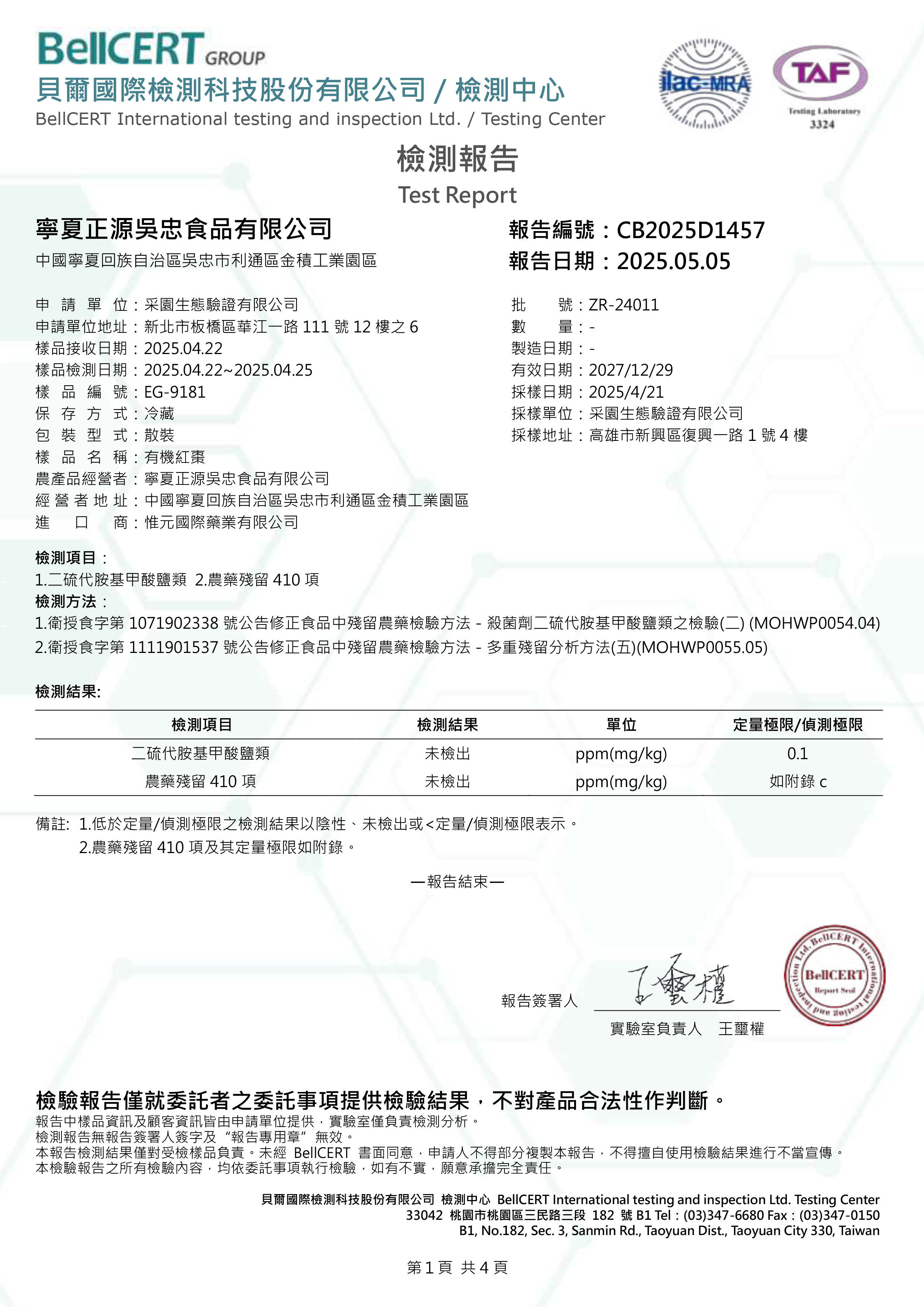 有 機 產 品 最 新 檢 驗 報 告 ( 進 口 日 期 2025/04 )