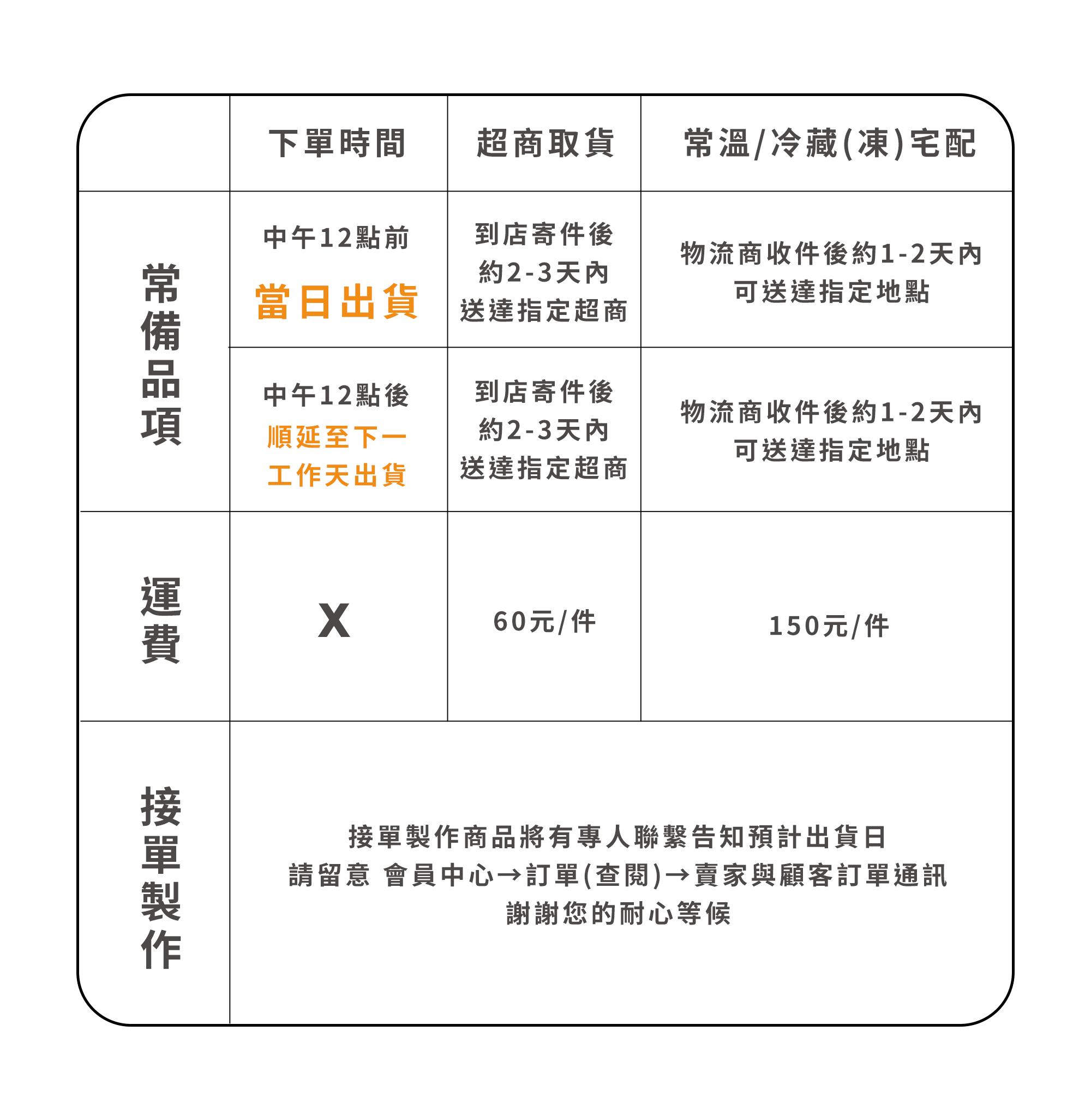 工作日中午12點後下單結帳➤順延至下一工作天出貨