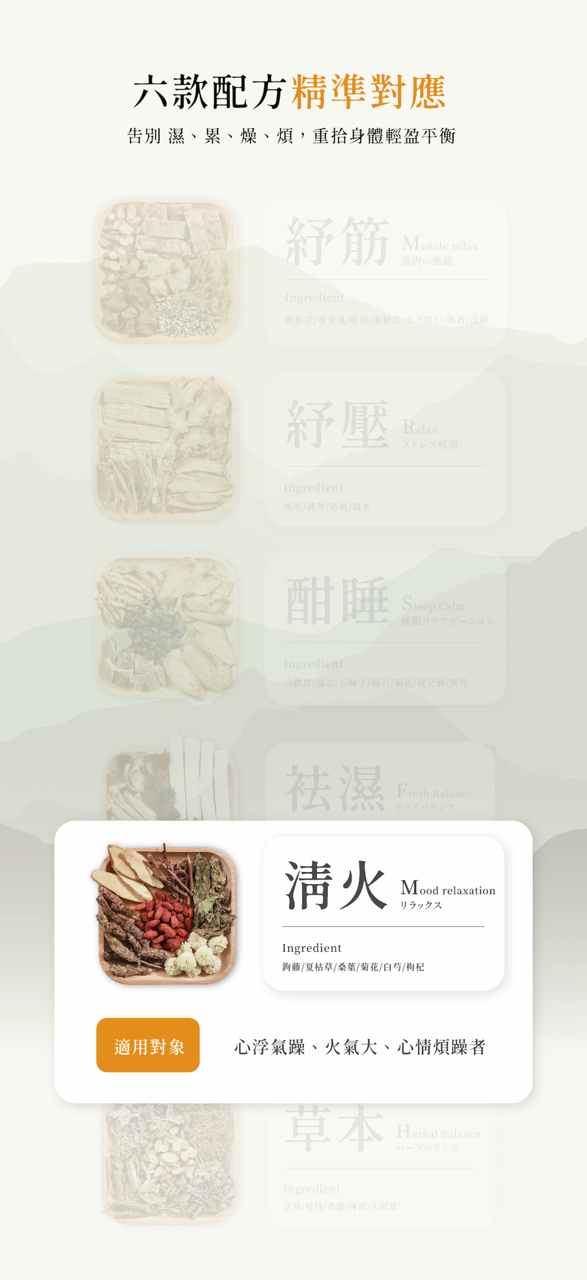 • 鉤藤/夏枯草/桑葉/菊花/白芍/枸杞