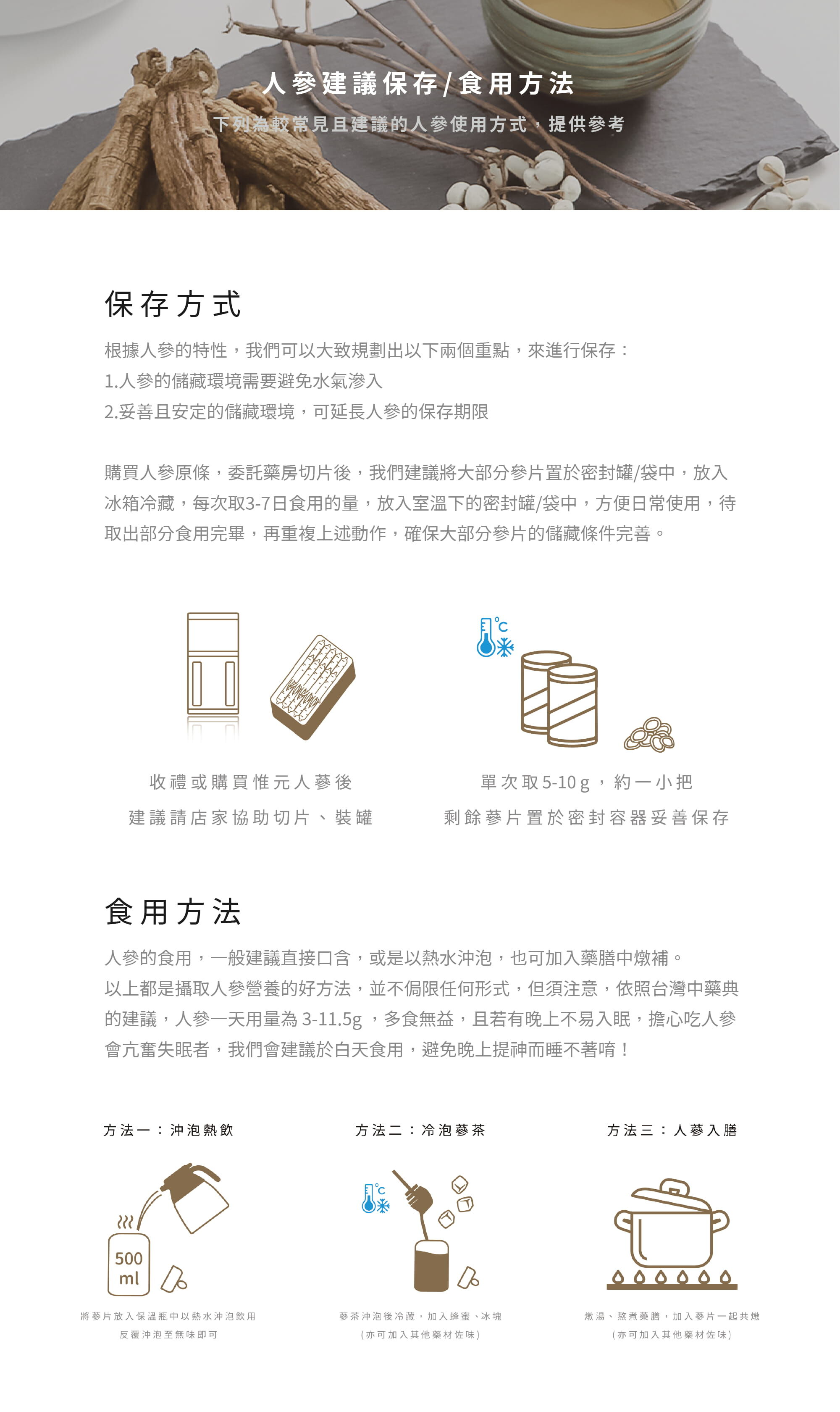 • 外皮淨白、蔘肉透紅,氣味濃厚